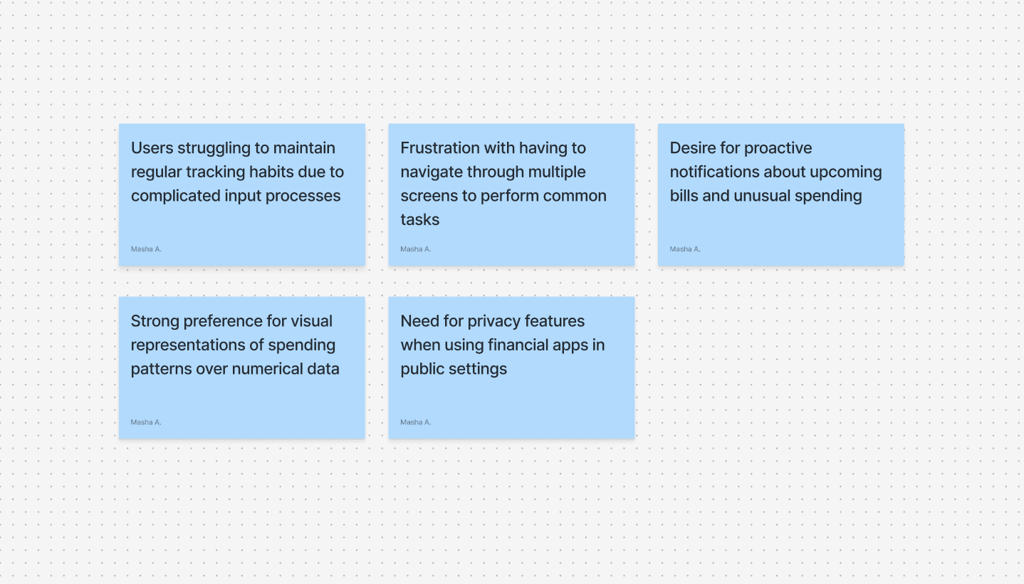 Gathered insights about financial tracking habits, pain points, and desired features, through interviews with peers and online surveys